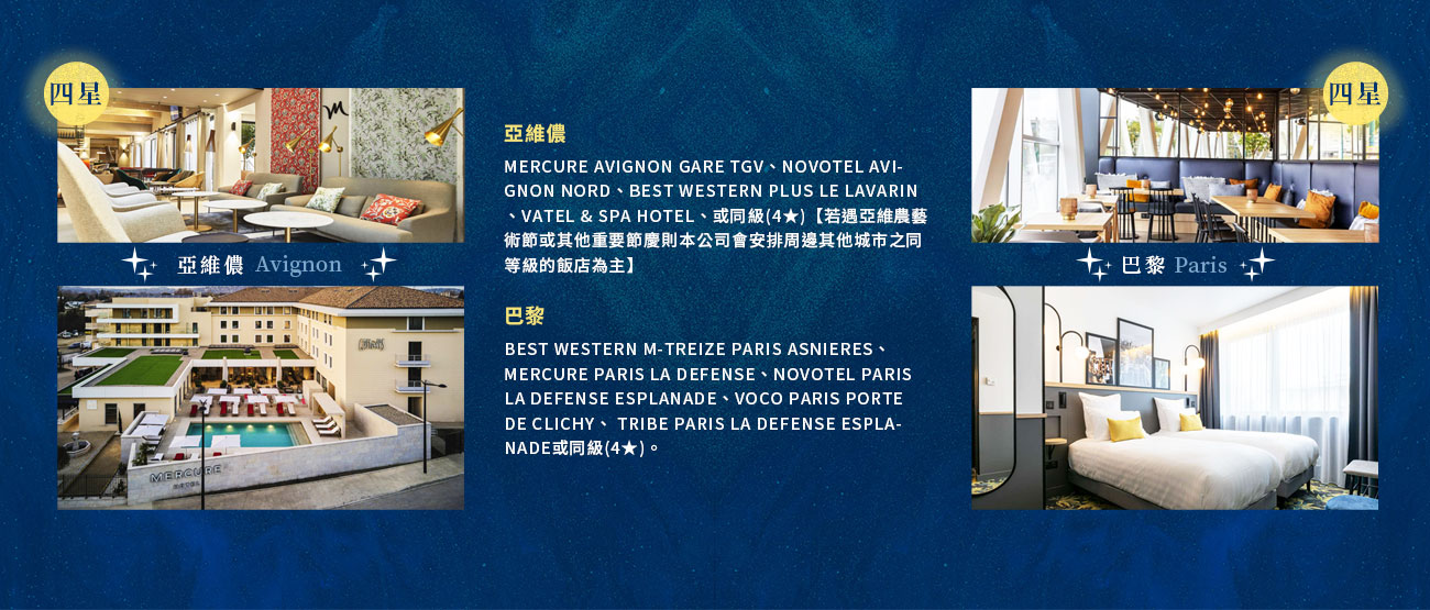 住宿:MERCURE AVIGNON GARE TGV、NOVOTEL AVIGNON NORD、BEST WESTERN PLUS LE LAVARIN、VATEL & SPA HOTEL、或同級(4★)【若遇亞維農藝術節或其他重要節慶則本公司會安排周邊其他城市之同等級的飯店為主】