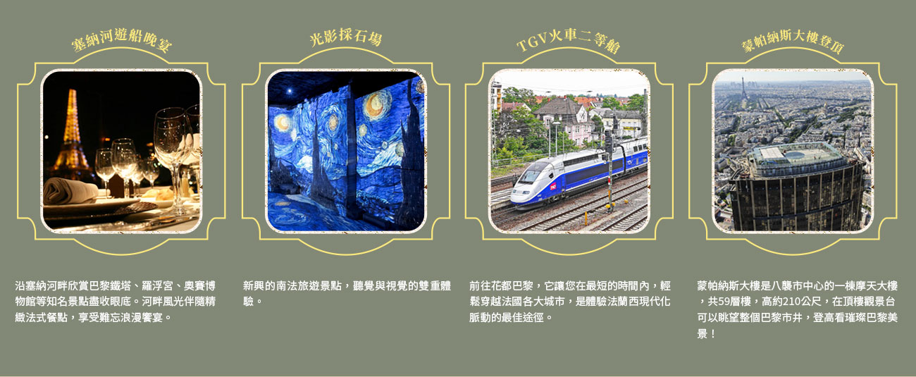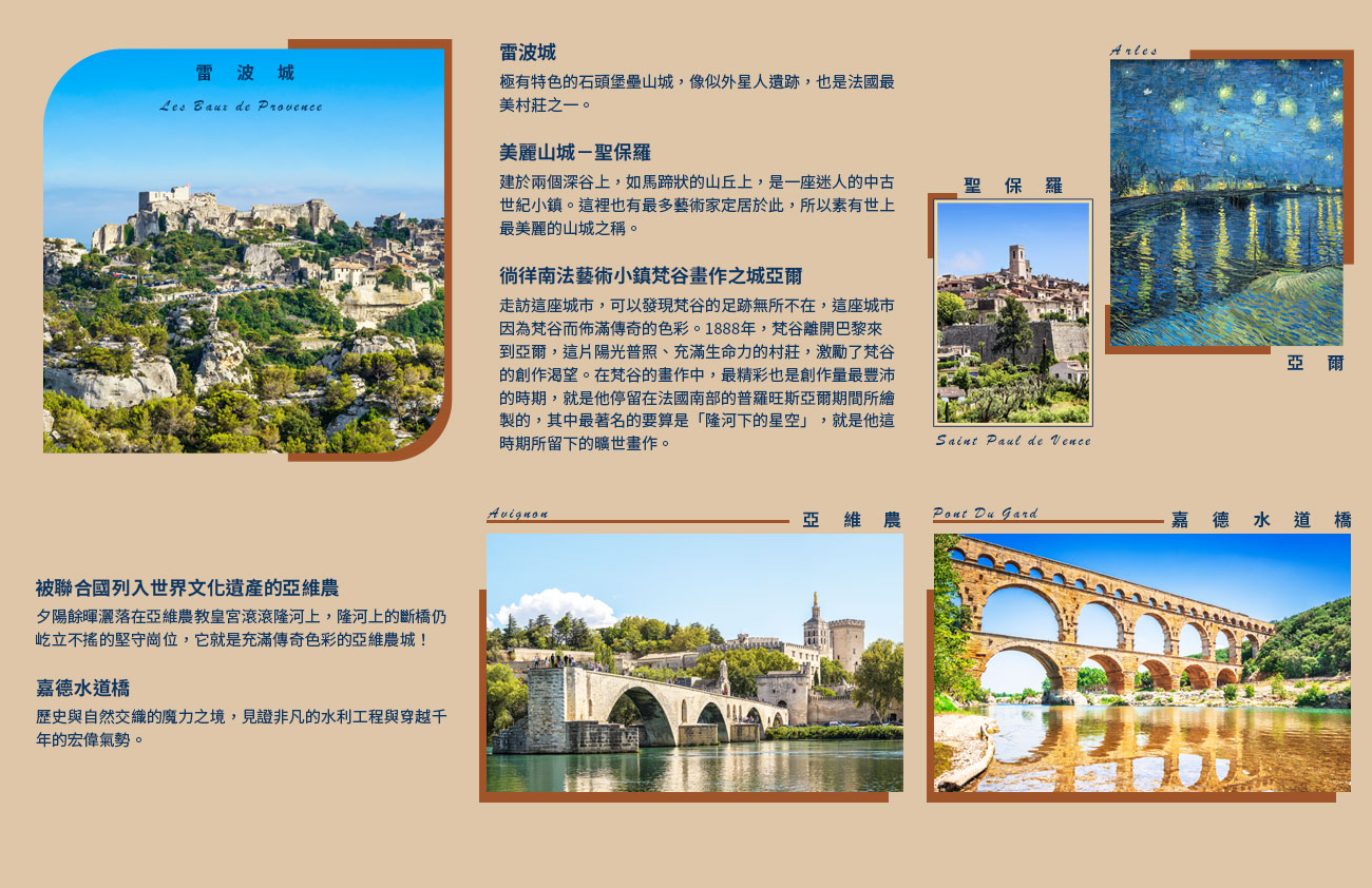 2026/08/23(日) | 桃園國際機場出發 光影流轉的南法11日:一場從普羅旺斯到里昂的浪漫之旅機位 26 候補0 已售0 可售25前10名早鳥3000元!雙宮、光影採石、TGV,品味法式美饌 |