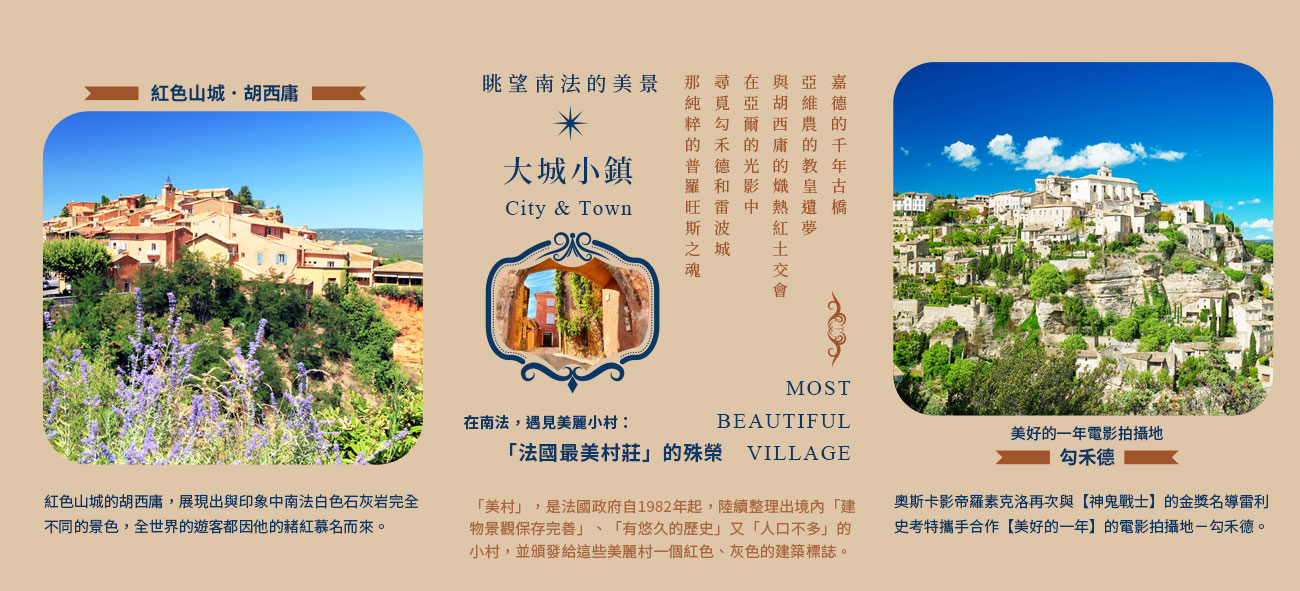 英國作家梅爾”山居歲月”中的普羅旺斯山城,讓全世界的觀光客魂牽夢縈的湧入法國南部,想像梅爾生活起居般的在普羅旺斯,感受鄉間生活的溫馨嗎?您一定要來到電影「美好的一年」拍攝地點,這個石頭堆砌起來的山城曾被票選為法國最美村莊之一,法文裡Gordes這個字就是「高高懸掛在空中的村子」的意思,是一個美麗的山城,層層疊疊依山而建的屋瓦,散發出一種樸實寧靜的氣息。