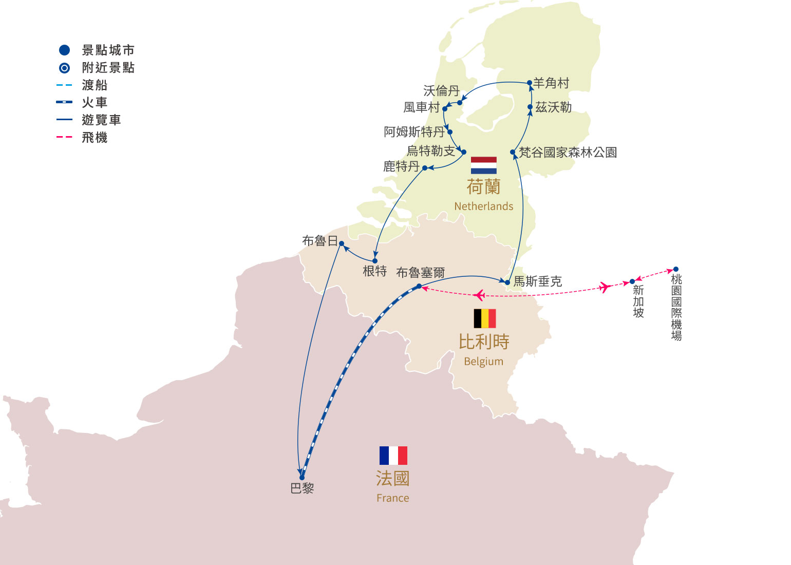 住宿:GOLDEN TULIP HOTEL DE MEDICI、HOTEL VELOTEL、GREEN PARK HOTEL BRUGGE或同級(4★) 或同等級