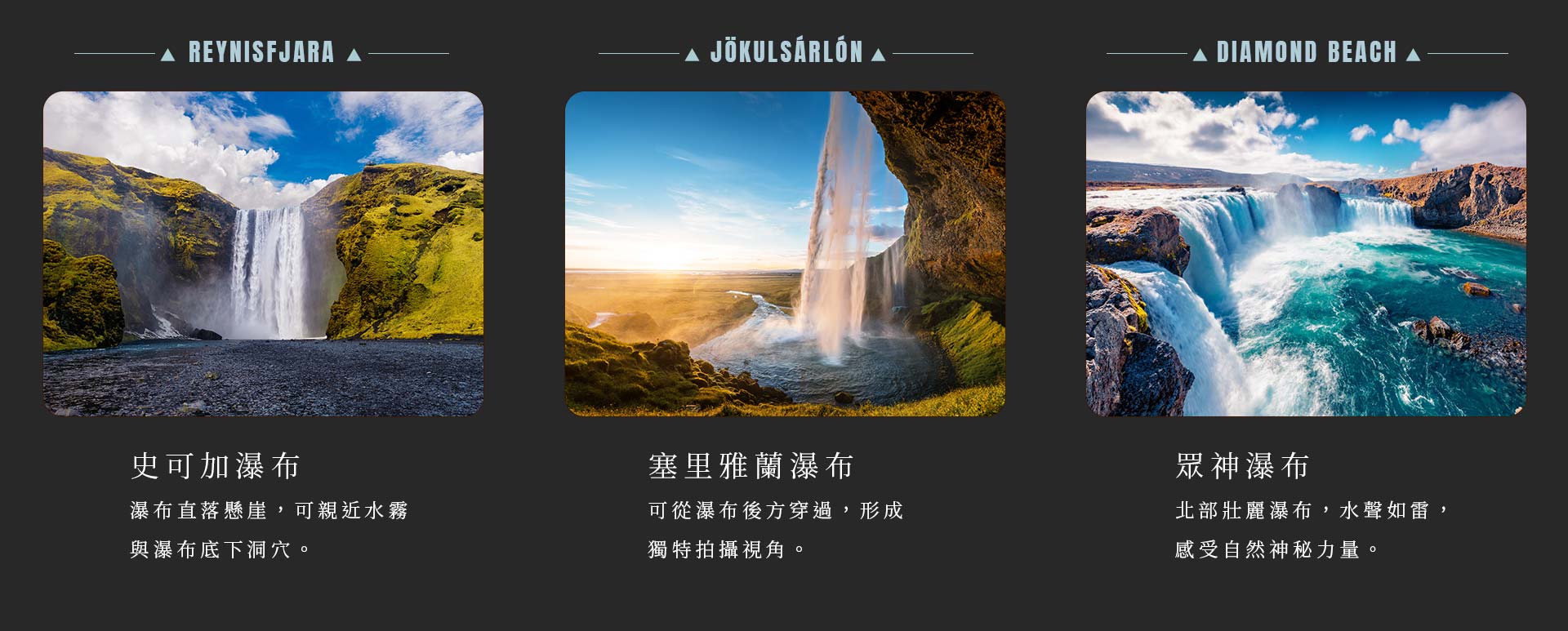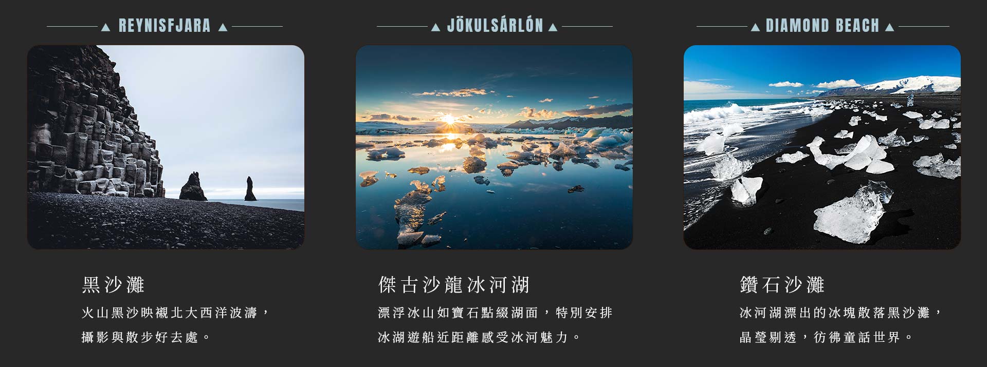 位於冰島南岸維克小鎮旁,是世界著名的火山沙灘。由火山熔岩冷卻後形成的黑色沙粒,與拍岸的白色浪花形成強烈對比。岸邊聳立的玄武岩石柱,如同巨人雕琢的宮殿。遠方的 Reynisdrangar 海蝕柱傳說是被陽光定格的巨人,增添神話色彩。這裡同時也是海鳥的棲息地,夏季可見海鸚展翅。/p>