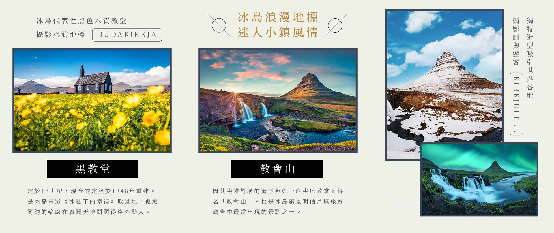 這座獨特的山峰高約463公尺,因其尖錐對稱的造型宛如一座尖塔教堂而得名「教會山」。它經常被譽為「冰島最上鏡的山」,也是冰島風景明信片與旅遊廣告中最常出現的景點之一。在山腳下的Kirkjufellsfoss瀑布,與教會山構成完美的畫面,是攝影愛好者必訪之地。