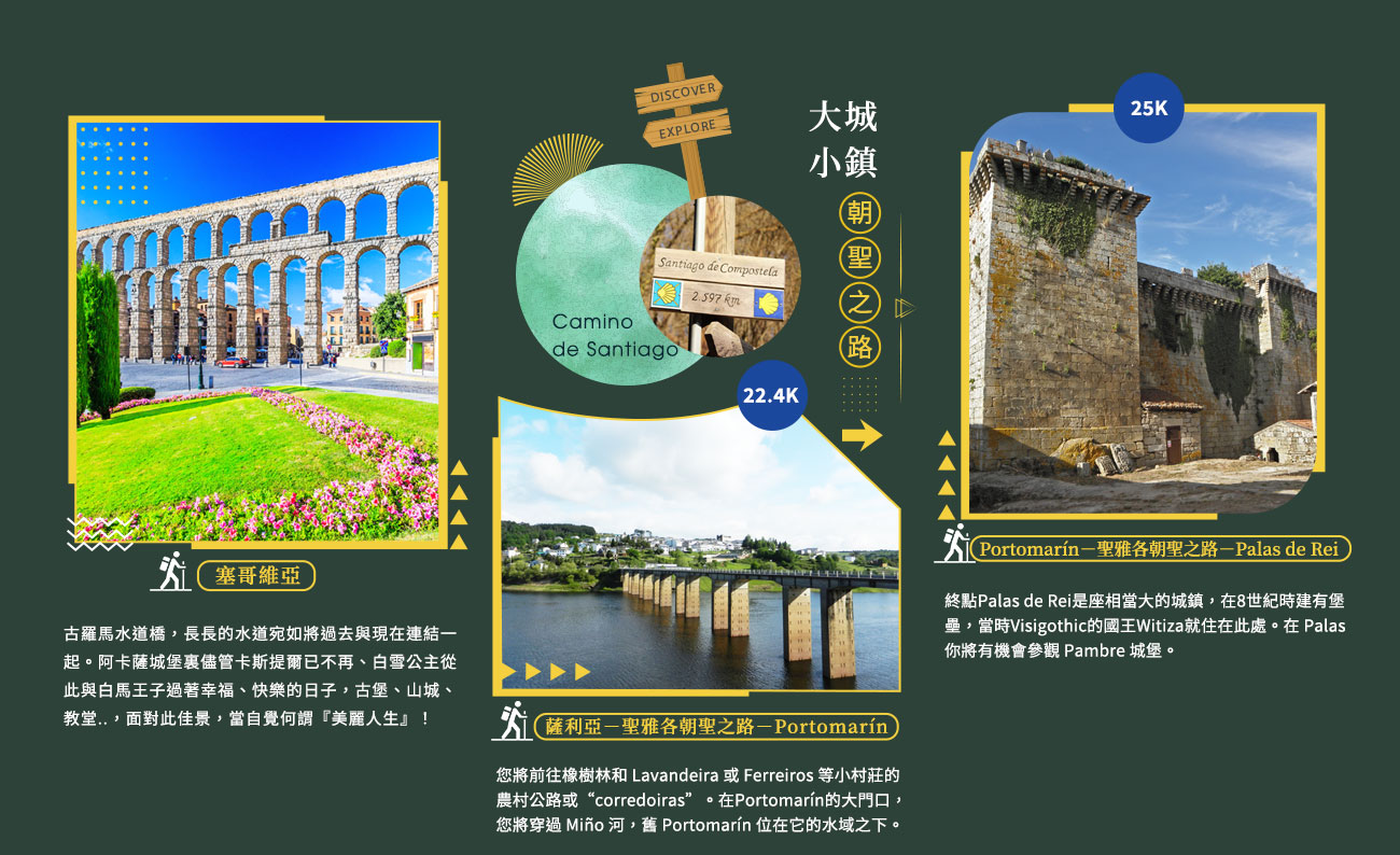 古羅馬水道橋,長長的水道宛如將過去與現在連結一起。阿卡薩城堡裏儘管卡斯提爾已不再、白雪公主從此與白馬王子過著幸福、快樂的日子,古堡、山城、教堂..,面對此佳景,當自覺何謂『美麗人生』! 午餐後驅車前往本次朝聖之路起點。薩利亞SARRIA