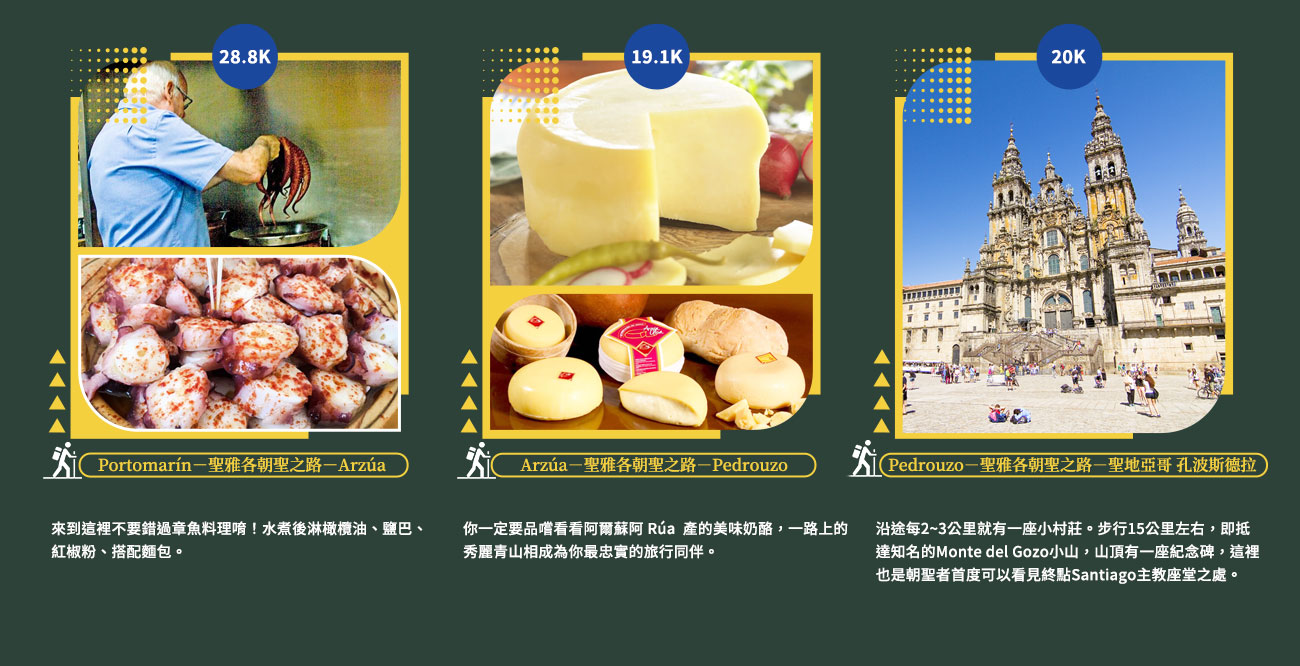 沿途每2~3公里就有一座小村莊。步行15公里左右,即抵達知名的Monte del Gozo小山,山頂有一座紀念碑,這裡也是朝聖者首度可以看見終點Santiago主教座堂之處。