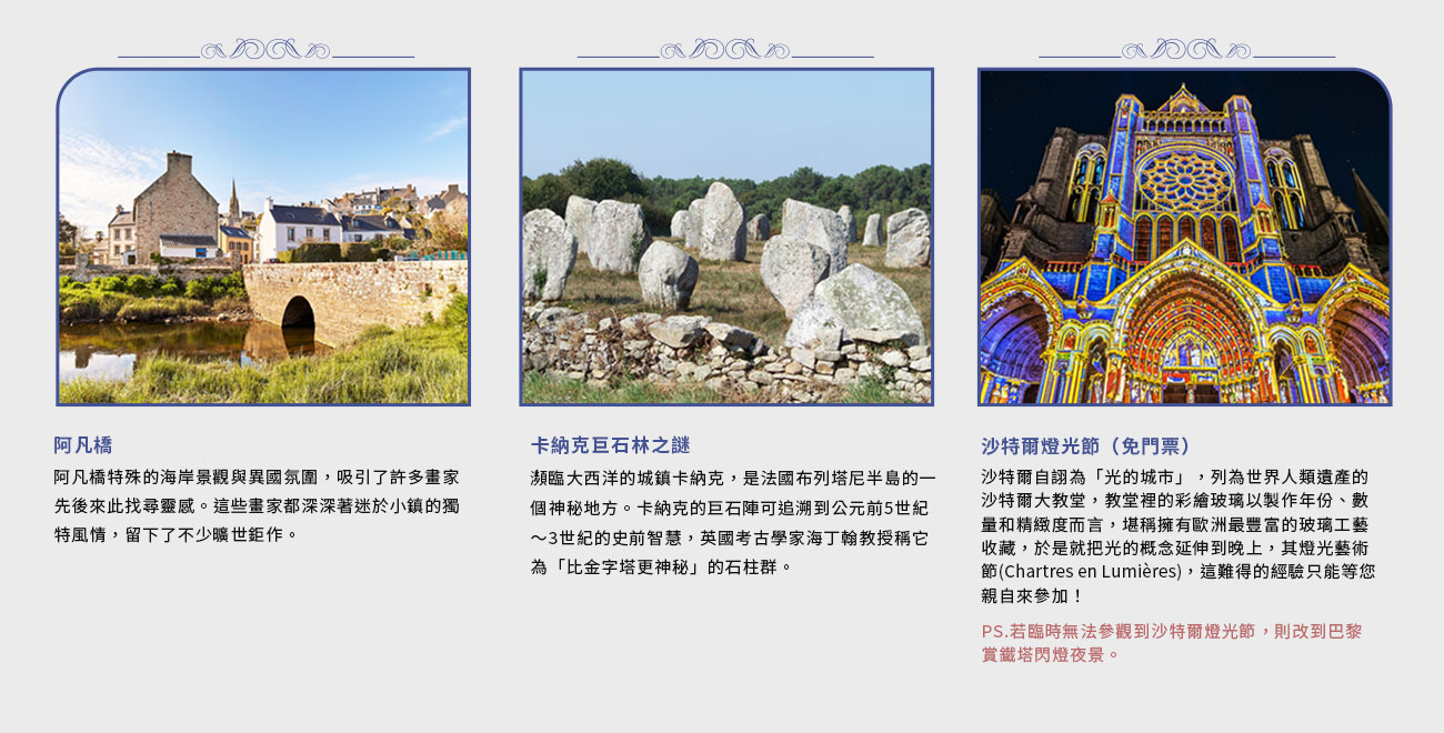 2026/08/04(週二) | 桃園國際機場出發 法蘭西秘境・從巨石到城堡的流動饗宴 北法 12日機位 26 候補0 已售0 可售25早鳥優惠最高4千元(含小費)|1島|雙宮|三堡|四大精選飯店 |